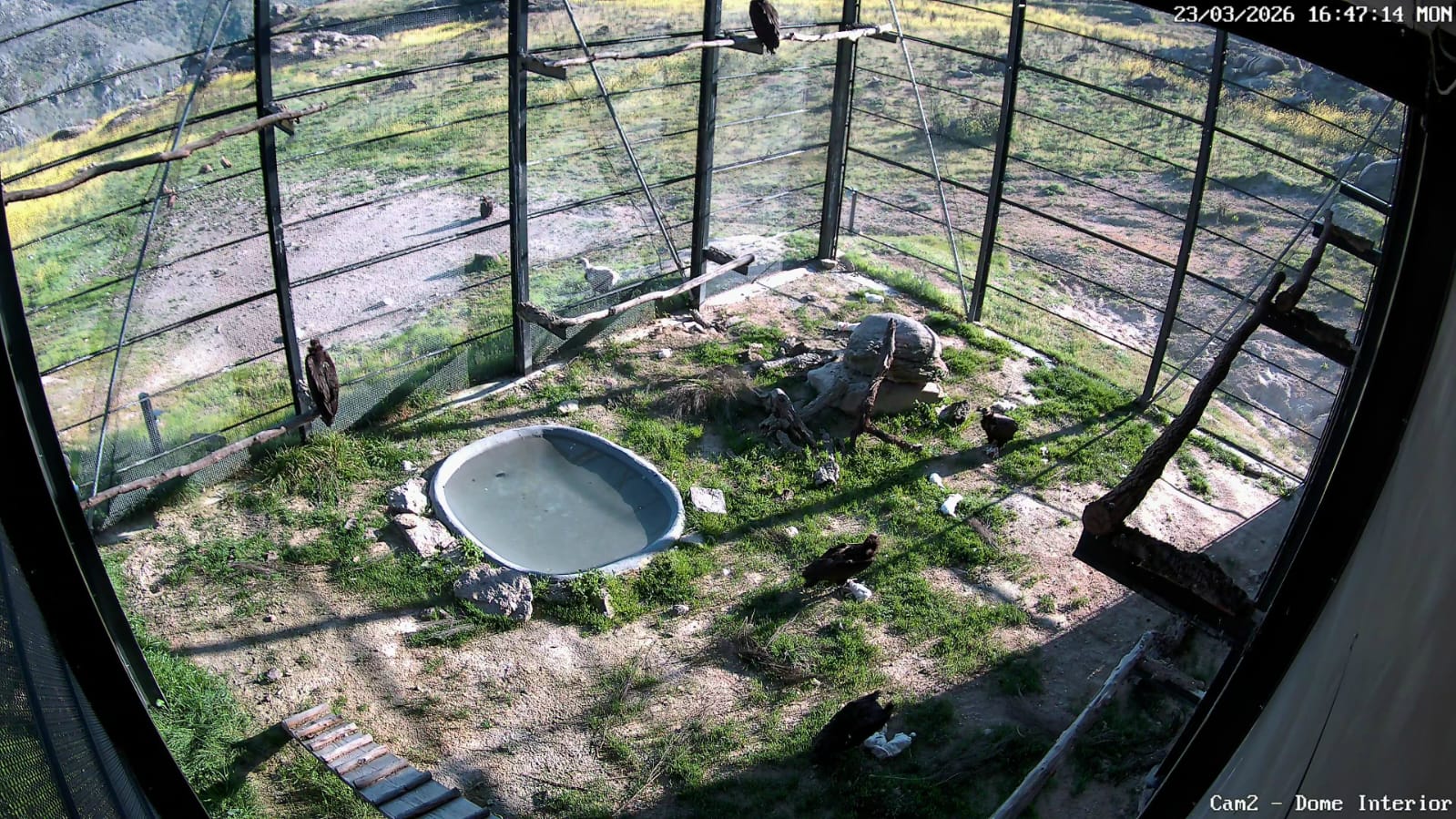 Novo grupo de abutres-pretos em aclimatação, com aves selvagens no exterior. Imagem obtida por videovigilância.