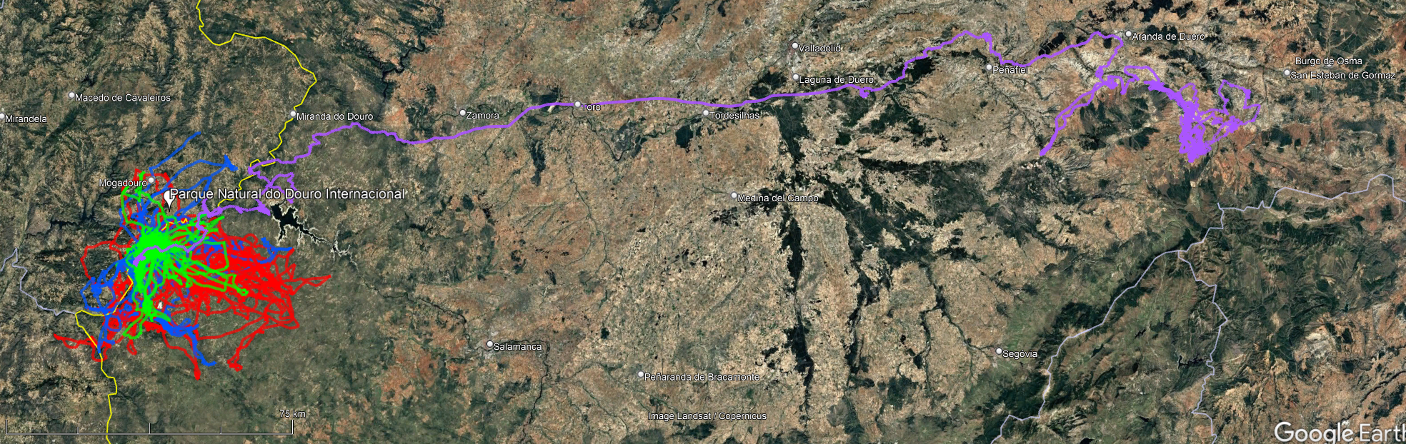 Movimentos dos quatro abutres-pretos que estiveram em aclimatação no Douro Internacional em 2024, desde a sua devolução à natureza, em novembro de 2024, até março de 2025. Azul – Azedinha; Verde – Arçã; Vermelho – Almeirão; Lilás – Alfavaca.