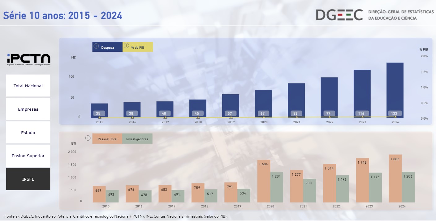 O IPCTN de 2024, publicado em 2025 e que inclui uma avaliação do potencial científico e tecnológico nacional entre 2015 e 2024, revela que houve um aumento contínuo do investimento na área por parte das IPSFL, incluindo ONG, e um crescimento, ainda que com algumas nuances, do número de pessoas dedicadas à investigação nestas entidades.