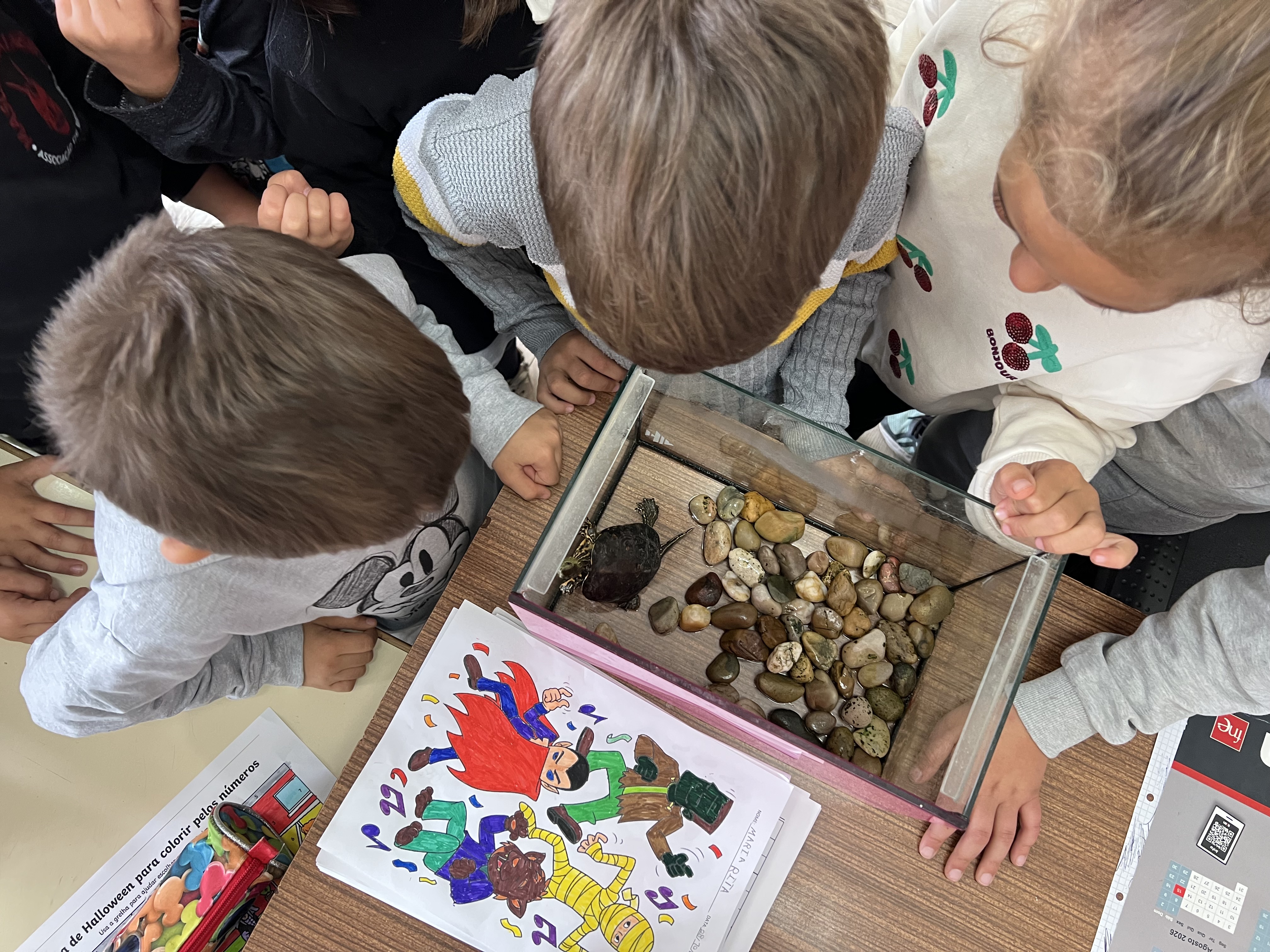 Observação do cágado-mediterrânico em sala de aula despertou grande interesse e curiosidade dos alunos. Fotografia Palombar.